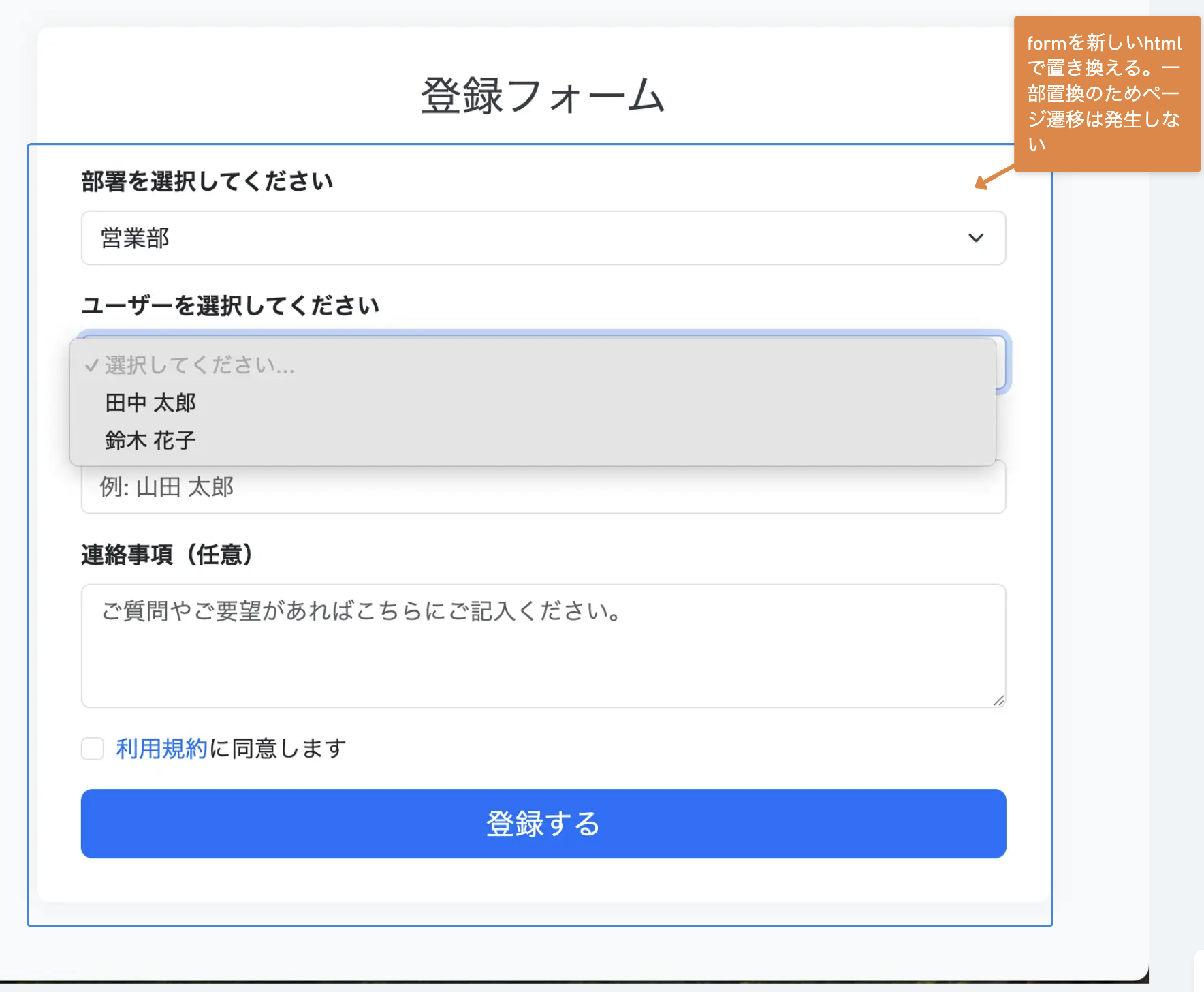 サーバーから送られてきたhtmlを使って画面を置換する(Turbo Frame) ユーザーから見るとSPAのような体験となる。